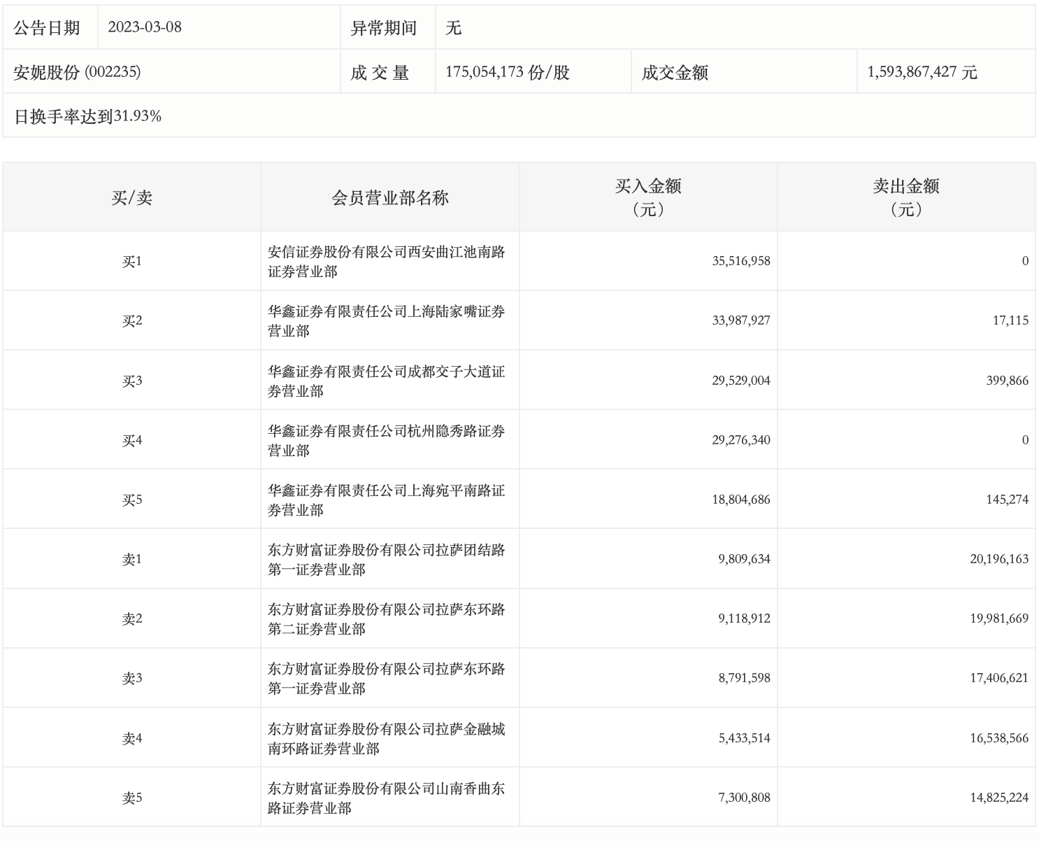 3月8日,安妮股份今日涨停,龙虎榜数据显示,上榜营业部席位全天成交2.77亿元,占当日总成交金额比例为17.38%。其中,买入金额为1.88亿元,卖出金额为8951.05万元,合计净买入9805.89万元。