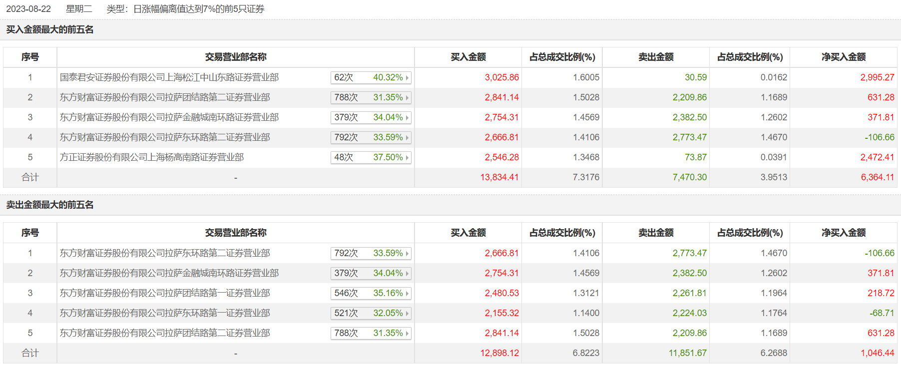 具体来看,国泰君安证券上海松江中山东路证券营业部、东方财富证券拉萨团结路第二证券营业部分别买入3025.86万元、2841.14万元;东方财富证券拉萨东环路第二证券营业部、东方财富证券拉萨金融城南环路证券营业部分别卖出2773.47万元、2382.50万元。