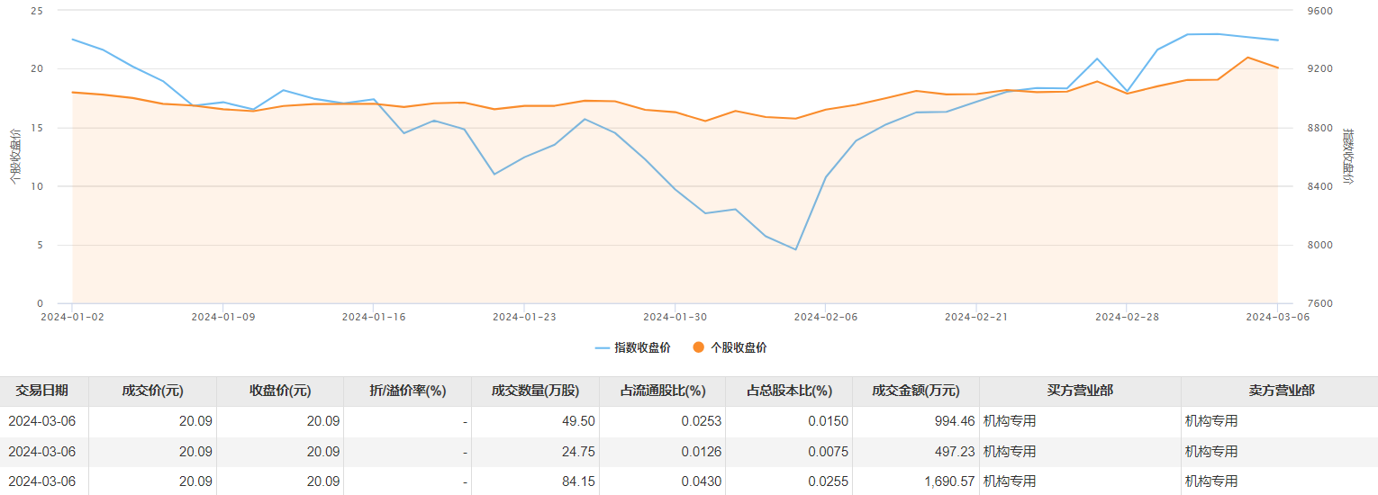 3月6日大宗交易成交158.4万股,成交额3182.26万元,占当日总成交额的0.92%,成交价20.09元,较市场收盘价20.09元持平。