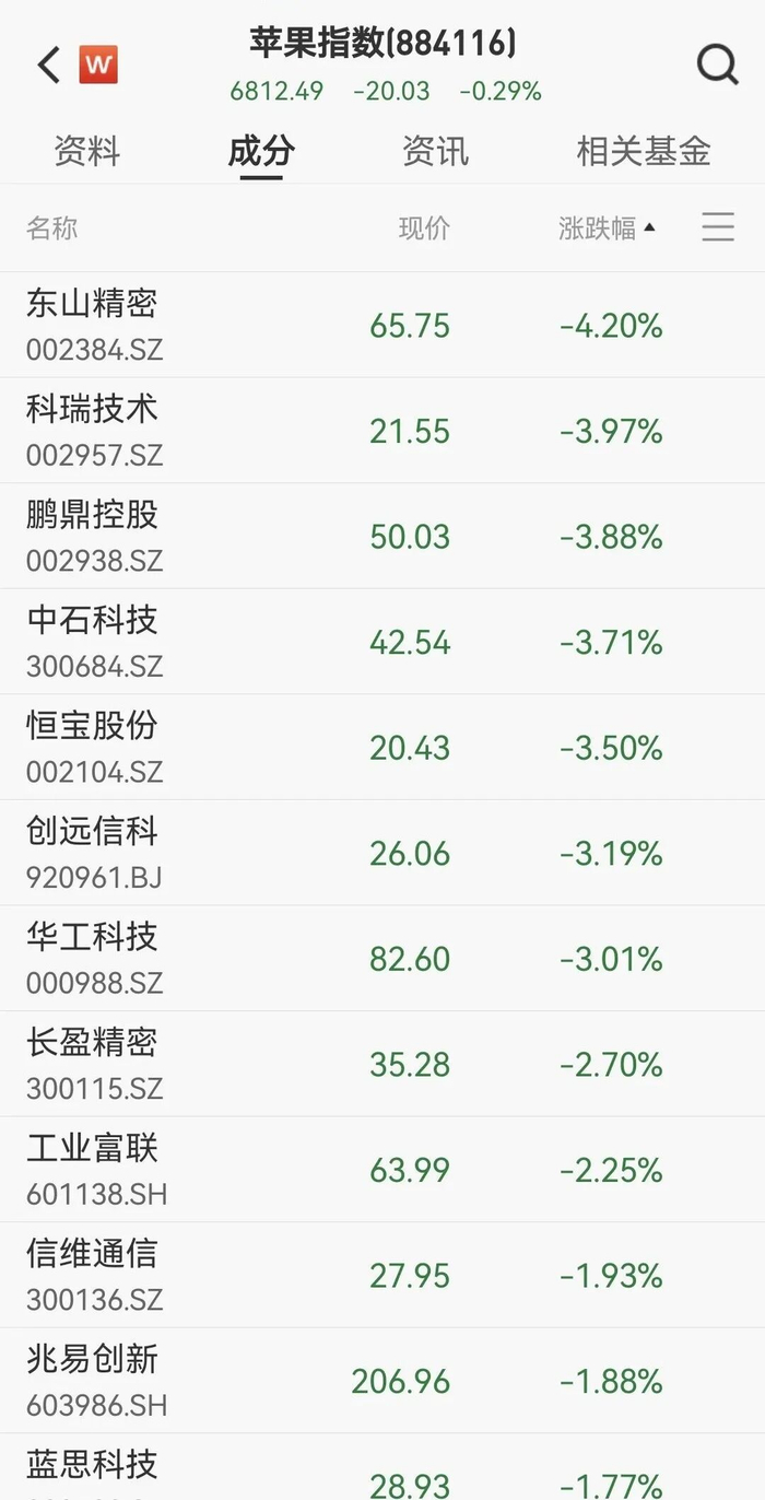 10月23日,苹果概念股下跌,一度下跌1.79%;截至收盘跌幅收窄,下跌0.29%。其中,东山精密跌超4%,科瑞技术、鹏鼎控股、中石科技等跌超3%。