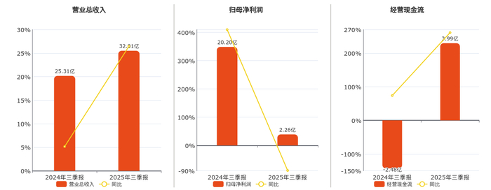公司营业总收入为32.01亿元,较去年同报告期营业总收入增加6.70亿元,实现2年连续上涨,同比较去年同期上涨26.45%。归母净利润为2.26亿元,较去年同报告期归母净利润减少17.94亿元,同比较去年同期下降88.83%。经营活动现金净流入为3.99亿元,较去年同报告期经营活动现金净流入增加6.48亿元,实现2年连续上涨。