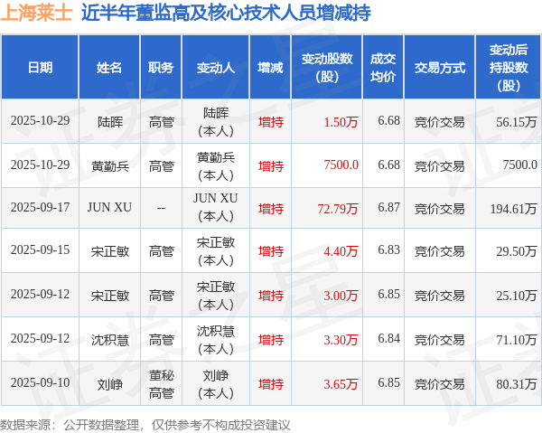 证券之星消息,根据10月30日市场公开信息、上市公司公告及交易所披露数据整理,上海莱士(002252)最新董监高及相关人员股份变动情况:2025年10月29日公司高管陆晖、高管黄勤兵共增持公司股份2.25万股,占公司总股本为0.0003%。变动期间公司股价上涨0.3%,10月29日当日收盘报6.7元。