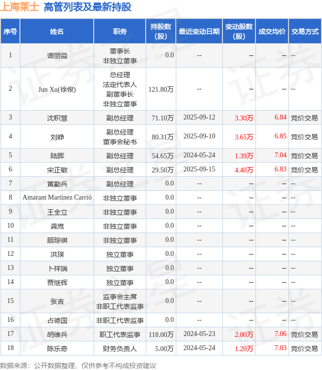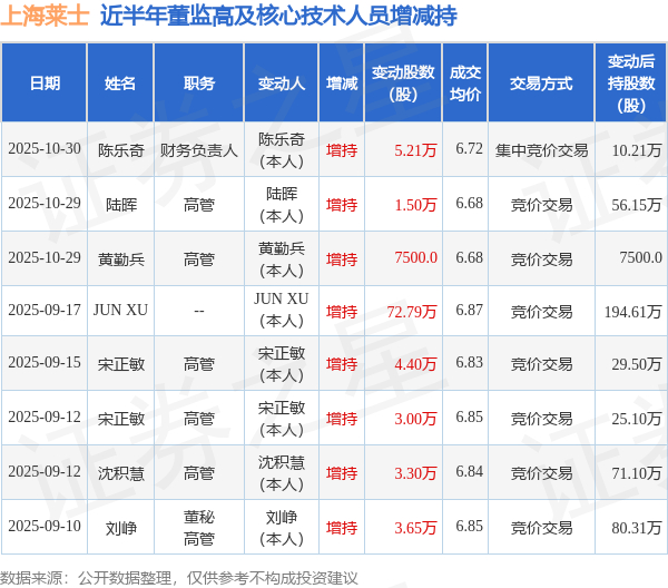 证券之星消息,根据10月31日市场公开信息、上市公司公告及交易所披露数据整理,上海莱士(002252)最新董监高及相关人员股份变动情况:2025年10月30日公司财务负责人陈乐奇共增持公司股份5.21万股,占公司总股本为0.0008%。变动期间公司股价上涨0.15%,10月30日当日收盘报6.71元。
