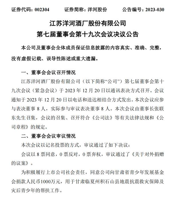 洋河股份捐款1000万元,用于震后救灾及青少年帮扶