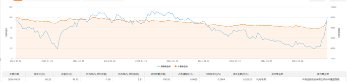 9月27日大宗交易成交100万股,成交额9022万元,占当日总成交额的3.76%,成交价90.22元,较市场收盘价91.13元折价1.0%。