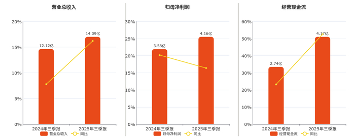 公司营业总收入为14.09亿元。归母净利润为4.16亿元。经营活动现金净流入为4.17亿元。