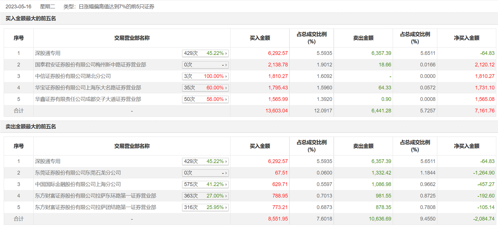 具体来看,深股通专用、国泰君安证券梅州新中路证券营业部分别买入6292.57万元、2138.78万元;深股通专用、东莞证券东莞石龙分公司分别卖出6357.39万元、1332.42万元。