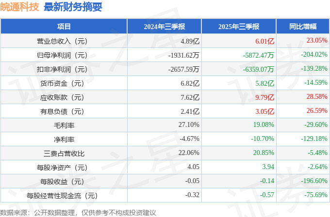 据证券之星公开数据整理,近期皖通科技(002331)发布2025年三季报。截至本报告期末,公司营业总收入6.01亿元,同比上升23.05%,归母净利润-5872.47万元,同比下降204.02%。按单季度数据看,第三季度营业总收入2.77亿元,同比上升90.93%,第三季度归母净利润-2128.22万元,同比下降77.75%。本报告期皖通科技公司应收账款体量较大,当期应收账款占最新年报归母净利润比达2652.84%。