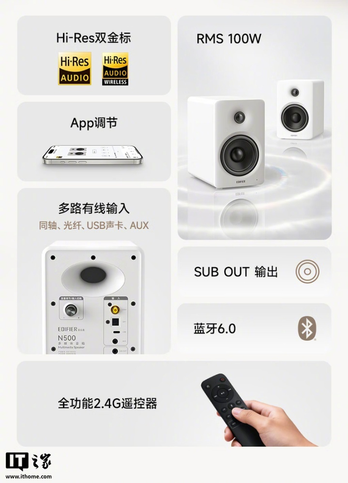 【999 元:漫步者 N500 桌面音箱开售,100W 额定功率 + 蓝牙 6.0】漫步者N500桌面音箱正式开售,100W额定功率+蓝牙6.0,支持多种音频输入方式,售价999元。内置4英寸铝盆重低音和1英寸丝绢膜高音单元,提供Hi-Res音质。详情点击:京东购买链接 #漫步者N500# #桌面音箱#