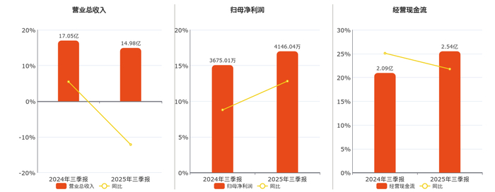 公司营业总收入为14.98亿元,较去年同报告期营业总收入减少2.07亿元,同比较去年同期下降12.13%。归母净利润为4146.04万元。经营活动现金净流入为2.54亿元。