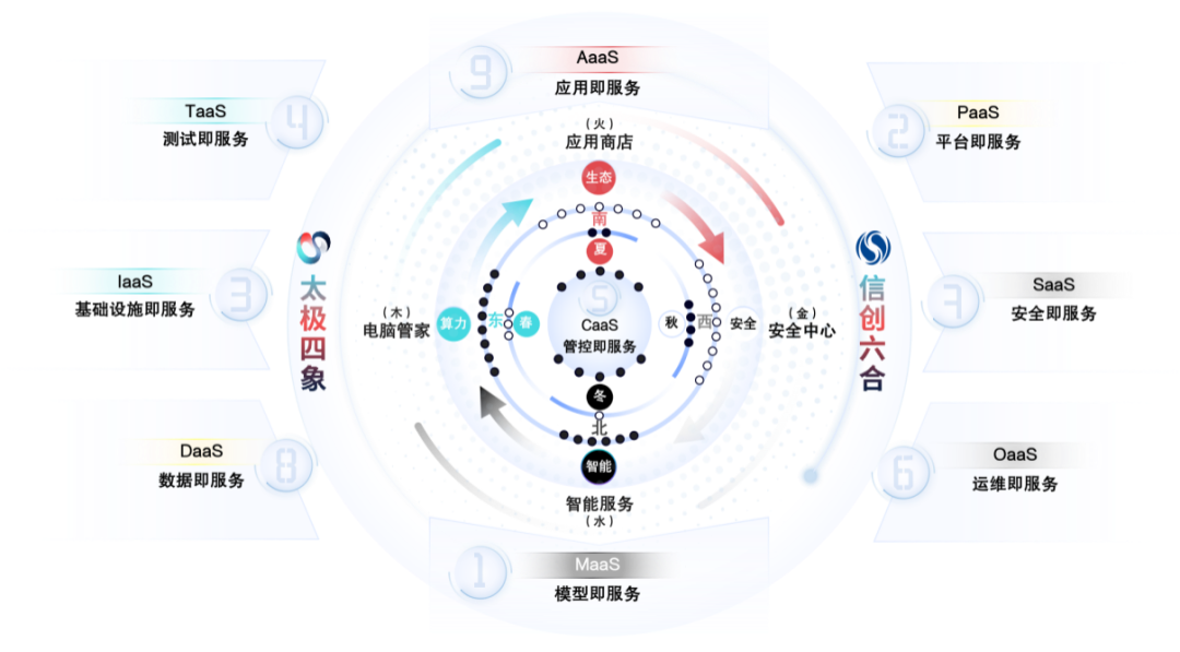 “四象”源自中国传统文化中的天人合一、时空一体的宇宙观,在此代表 “算力、生态、安全、智能” 四大产业核心能力。“六合平台”兼容六种CPU技术路线,提供八项云服务。