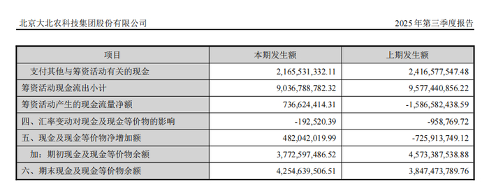 图源:大北农2025年第三季度报告同时,大北农也在通过增加长期借款以配置稳定的资金来源,支撑产能扩张与固定资产投入。根据大北农2025年第三季度报告,前三季度,其筹资活动净现金流约为7.37亿元,较去年同期的净流出状态实现反转。这一变化表明,其在外部融资方面仍具备一定的通道与弹性。