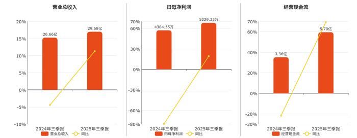 公司营业总收入为29.68亿元。归母净利润为5229.33万元。经营活动现金净流入为5.70亿元。