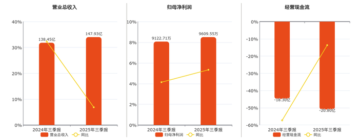 公司营业总收入为147.93亿元,在已披露的同业公司中排名第2,较去年同报告期营业总收入增加9.48亿元,实现5年连续上涨,同比较去年同期上涨6.85%。归母净利润为9609.55万元,在已披露的同业公司中排名第7,较去年同报告期归母净利润增加486.84万元,实现2年连续上涨,同比较去年同期上涨5.34%。经营活动现金净流入为-20.80亿元。
