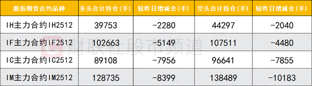 四大期指主力合约中,IH、IF、IC、IM合约多空双方均减仓,IM合约空头减仓数量较多。