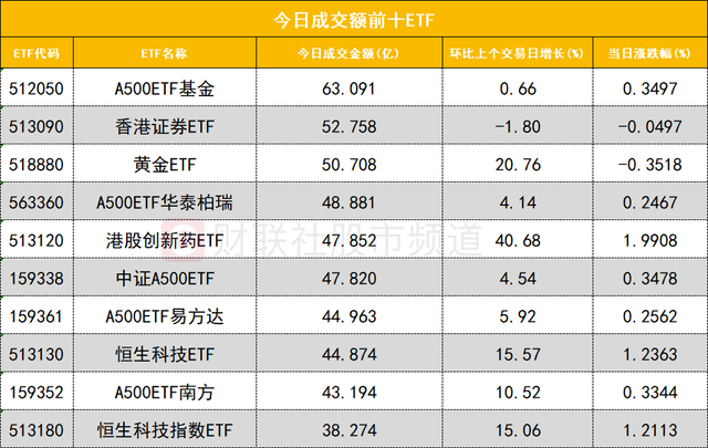 从成交额前十的ETF来看,A500ETF基金(512050)成交额位居首位,香港证券ETF(513090)成交额位居次席。