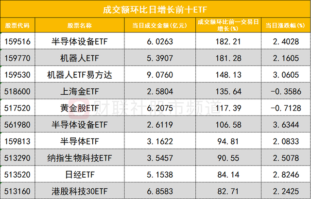 从成交额环比增长前十的ETF来看,半导体设备ETF(159516)成交额环比增长182%位居首位;机器人ETF(159770)成交额环比增长181%位居次席。