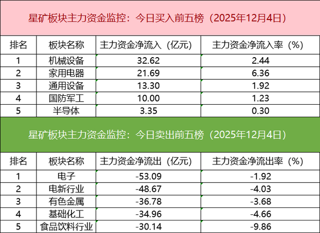 板块资金流出方面,电子板块主力资金净流出居首。