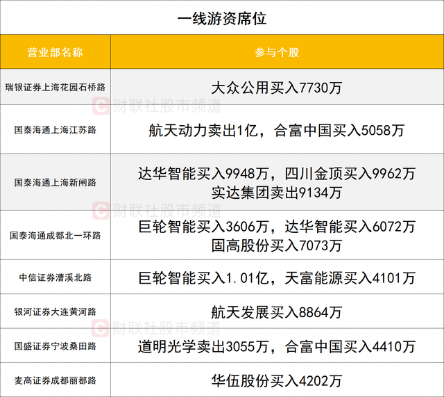 一线游资活跃度有所降低,航天发展获一家实力游资席位(中国银河大连黄河路)买入8864万。航天动力遭一家一线游资席位(国泰海通上海江苏路)卖出1亿。