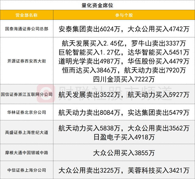 量化资金活跃度一般,航天发展获一家量化资金席位(开源证券西安西大街)大幅买入2.45亿;此外该席位耗资1.27亿大幅买入巨轮智能。