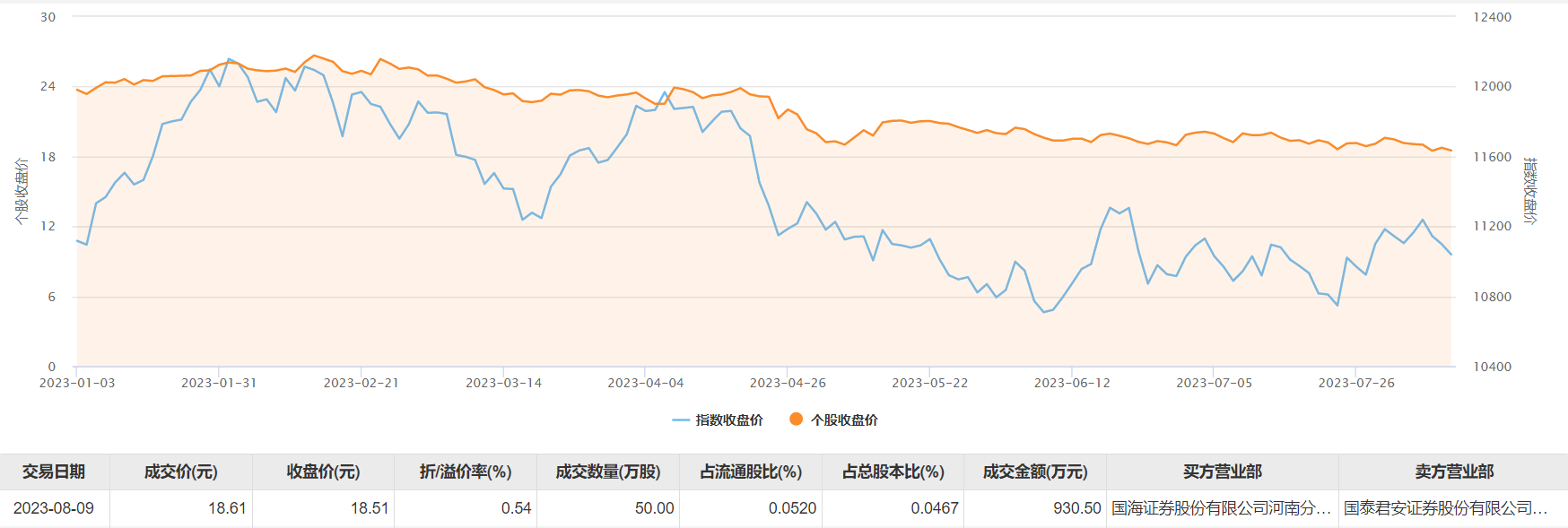8月9日大宗交易成交50万股,成交额930.5万元,占当日总成交额的2.5%,成交价18.61元,较市场收盘价18.51元溢价0.54%。