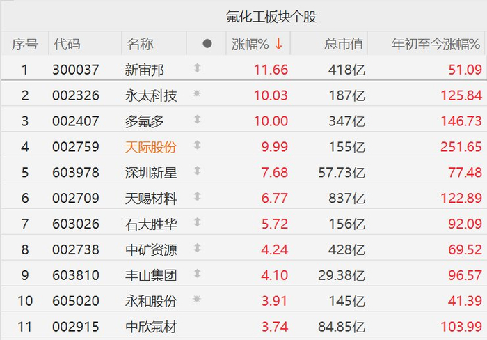 格隆汇10月31日|A股市场氟化工股集体走强,其中,新宙邦涨超11%,永太科技、多氟多、天际股份10CM涨停,深圳新星涨超7%,天赐材料涨超6%,石大胜华涨超5%。
