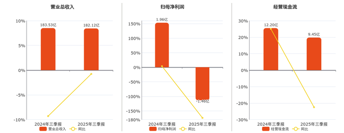 公司营业总收入为182.12亿元,在已披露的同业公司中排名第9,较去年同报告期营业总收入减少1.41亿元,同比较去年同期下降0.77%。归母净利润为-1.46亿元,在已披露的同业公司中排名第21,较去年同报告期归母净利润减少3.42亿元,同比较去年同期下降174.19%。经营活动现金净流入为9.45亿元,在已披露的同业公司中排名第6,较去年同报告期经营活动现金净流入减少2.74亿元,同比较去年同期下降22.49%。