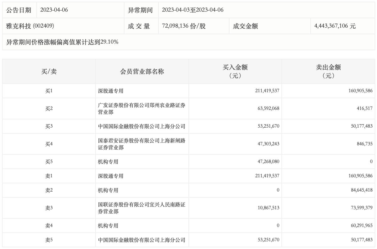 4月6日,雅克科技今日涨停,龙虎榜数据显示,上榜营业部席位全天成交3.78亿元,占当日总成交金额比例为23.73%。其中,买入金额为2.14亿元,卖出金额为1.64亿元,合计净买入4945.1万元。