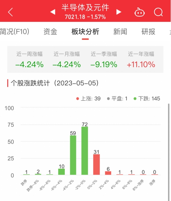 中国经济网北京5月5日讯今日,半导体及元件板块整体涨幅-1.57%,其中39只股票上涨,1只股票平盘,145只股票下跌。