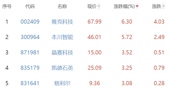 其中,雅克科技、本川智能、晶赛科技、凯德石英、格利尔位列板块涨幅前五位,涨幅分别为6.30%、5.72%、3.52%、3.25%、3.08%。