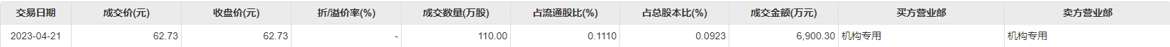 4月21日大宗交易成交110万股,成交额6900.3万元,占当日总成交额的9.54%,成交价62.73元,较市场收盘价62.73元持平。