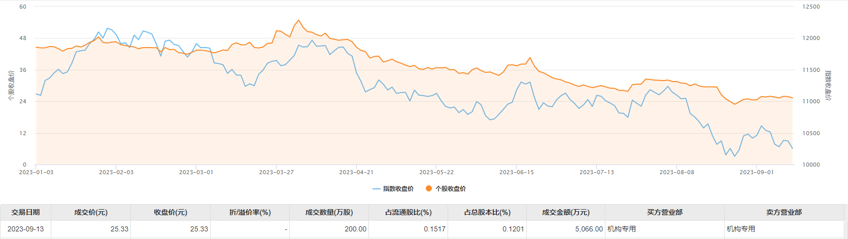 今日大宗交易成交200万股,成交额5066万元,占当日总成交额的17.12%,成交价25.33元,较市场收盘价25.33元持平。