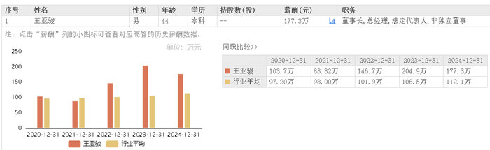 据东方财富网数据,康盛股份董事长兼总经理王亚骏2024年所获薪酬为177.3万元,相较上年薪酬204.9万元降薪13.47%。