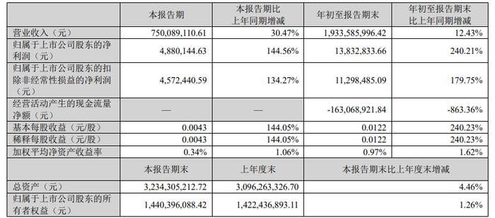 其中第三季度,康盛股份营业收入为7.50亿元,同比增长30.47%;归母净利润为488.01万元,同比增长144.56%;扣非归母净利润为457.24万元,同比增长134.27%;基本每股收益0.0043元。