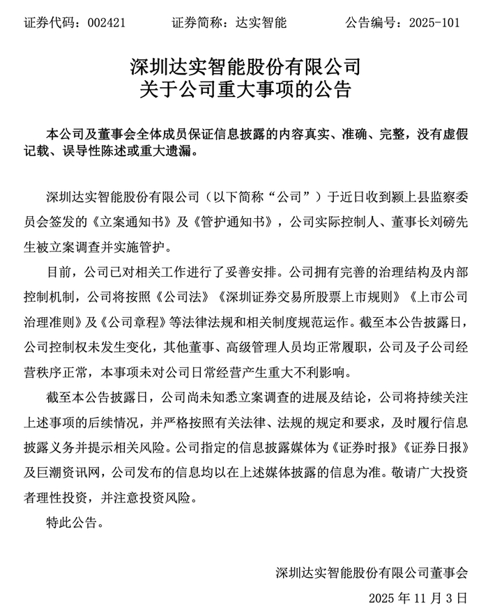 11月3日晚间,达实智能公告,公司实际控制人、董事长刘磅被颍上县监察委员会立案调查并实施管护。公司已对相关工作进行妥善安排,控制权未发生变化,其他董事、高级管理人员均正常履职,公司及子公司经营秩序正常,本事项未对公司日常经营产生重大不利影响。