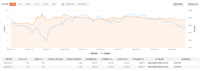 今日大宗交易成交1894.02万股,成交额1.44亿元,占当日总成交额的55%,成交价7.61元,较市场收盘价持平。
