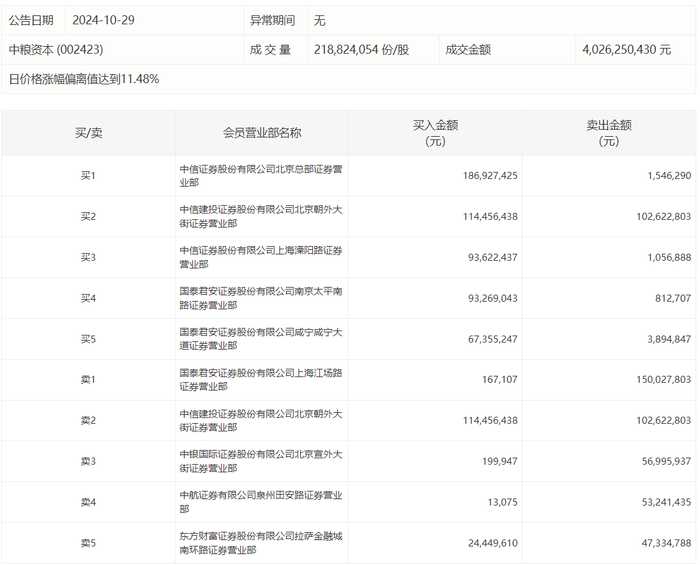 中粮资本今日涨停,龙虎榜数据显示,上榜营业部席位全天成交9.98亿元,占当日总成交金额比例为24.79%。其中,买入金额为5.8亿元,卖出金额为4.18亿元,合计净买入1.63亿元。
