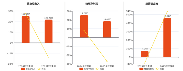 公司营业总收入为138.96亿元,较去年同报告期营业总收入减少22.67亿元,同比较去年同期下降14.03%。归母净利润为10.00亿元,较去年同报告期归母净利润减少3.72亿元,同比较去年同期下降27.13%。经营活动现金净流入为15.37亿元,较去年同报告期经营活动现金净流入增加12.95亿元,同比较去年同期上涨534.23%。