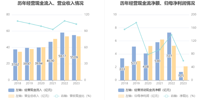 2023年,公司经营活动现金流净额为1.25亿元,同比下降82.75%;筹资活动现金流净额25.72亿元,同比增加10.47亿元;投资活动现金流净额-17.90亿元,上年同期为-23.31亿元。