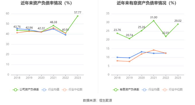 在偿债能力方面,公司2023年年末资产负债率为57.77%,相比上年末上升16.86个百分点;有息资产负债率为29.02%,相比上年末上升7.01个百分点。