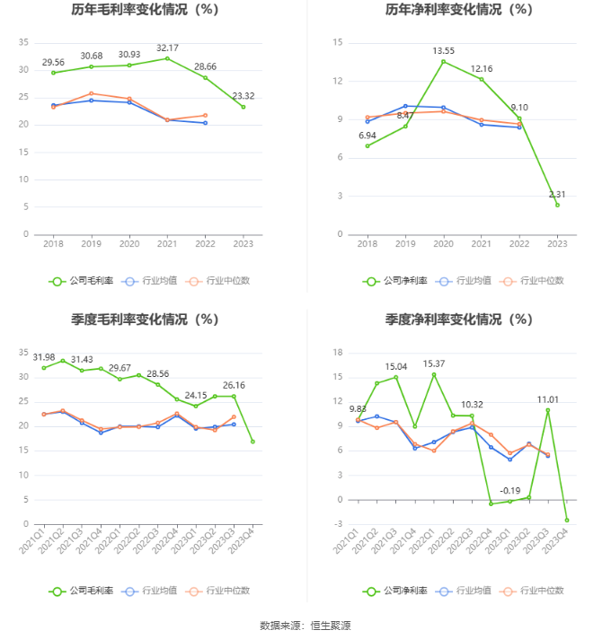 2023年,公司毛利率为23.32%,同比下降5.34个百分点;净利率为2.31%,较上年同期下降6.79个百分点。从单季度指标来看,2023年第四季度公司毛利率为16.89%,同比下降8.66个百分点,环比下降9.27个百分点;净利率为-2.49%,较上年同期下降1.99个百分点,较上一季度下降13.50个百分点。