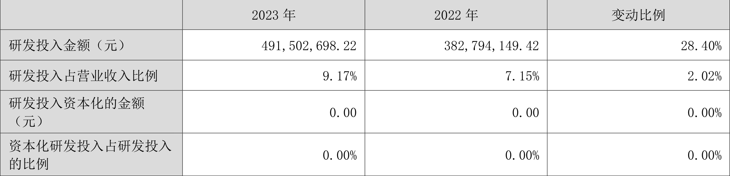 2023年全年,公司研发投入金额为4.92亿元,同比增长28.40%;研发投入占营业收入比例为9.17%,相比上年同期上升2.02个百分点。此外,公司全年研发投入资本化率为0。