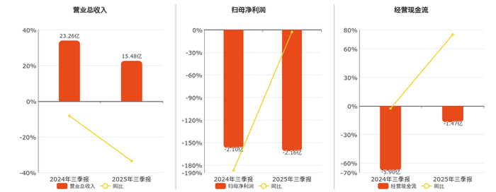 公司营业总收入为15.48亿元,在已披露的同业公司中排名第22,较去年同报告期营业总收入减少7.78亿元,同比较去年同期下降33.46%。归母净利润为-2.16亿元,在已披露的同业公司中排名第79,较去年同报告期归母净利润减少568.26万元。经营活动现金净流入为-1.47亿元,在已披露的同业公司中排名第60,较去年同报告期经营活动现金净流入增加4.43亿元。