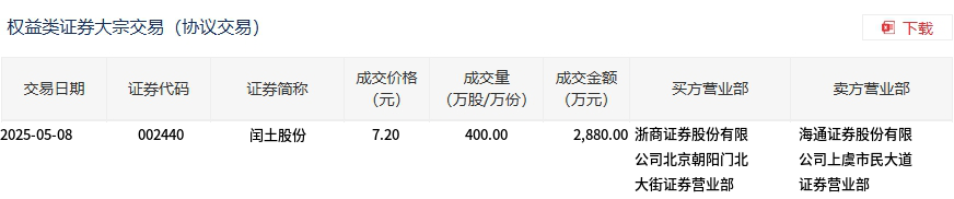 闰土股份今日大宗交易折价成交400万股,成交额2880万元