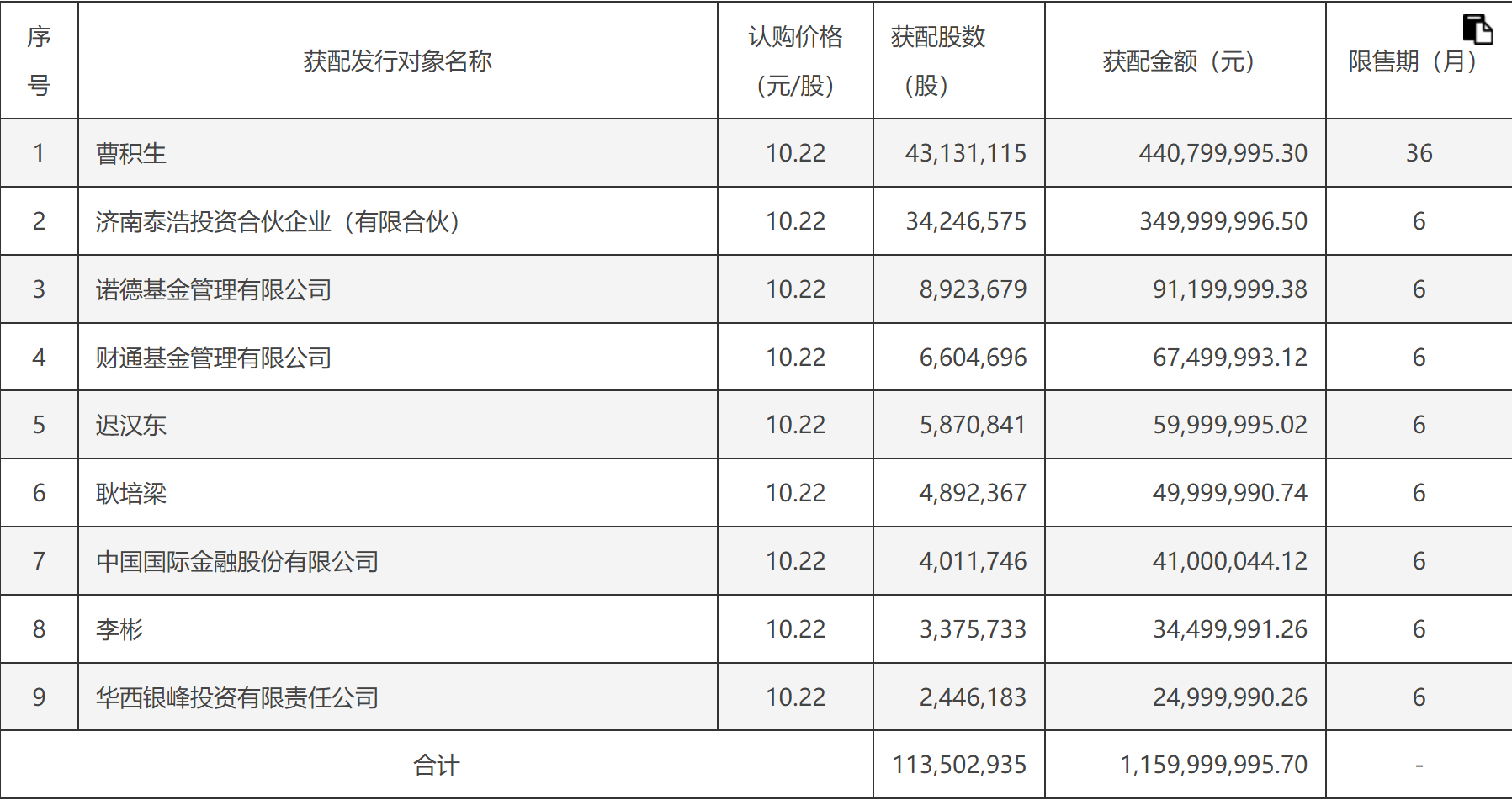 11月29日公告,本次非公开发行1.13亿股公司股份,发行价10.22元/股,募集资金11.6亿元,控股股东曹积生、诺德基金等9名对象获配。