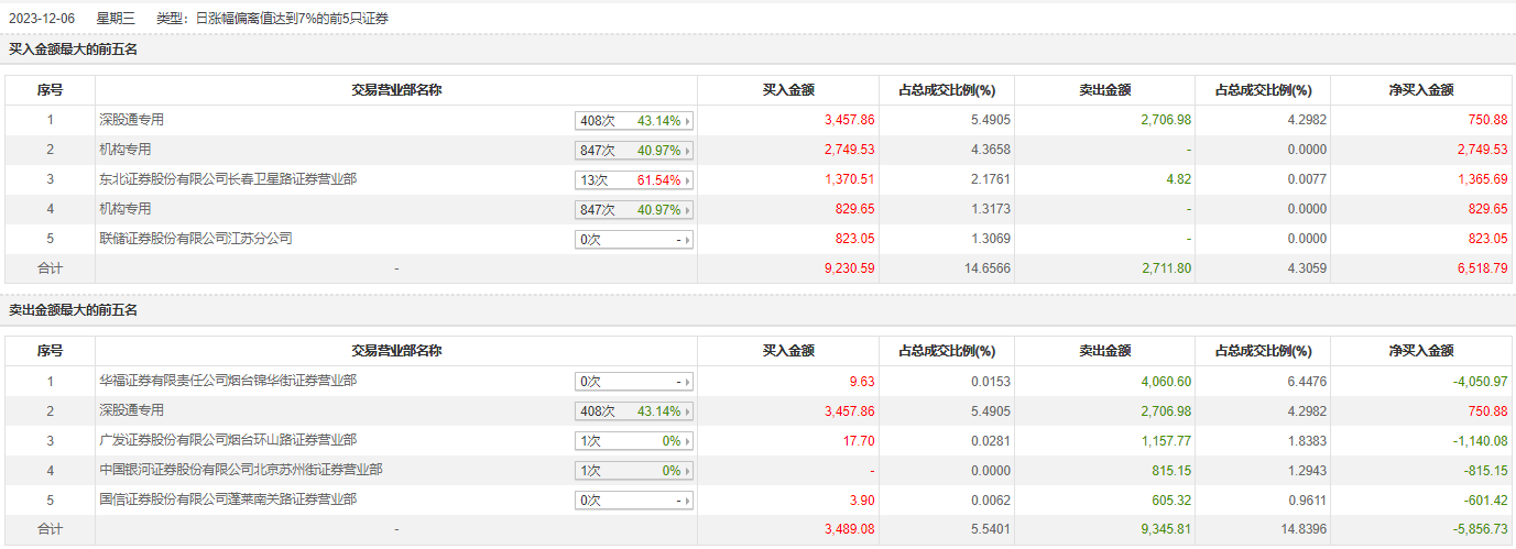 益生股份12月6日涨停,全天换手率达8.04%,振幅达10.01%。龙虎榜数据显示,营业部席位合计净卖出88.82万元。其中,机构合计净买入3579.17万元。此外,深股通专用、东北证券长春卫星路证券营业部分别买入3457.86万元、1370.51万元;华福证券烟台锦华街证券营业部、深股通专用分别卖出4060.60万元、2706.98万元。