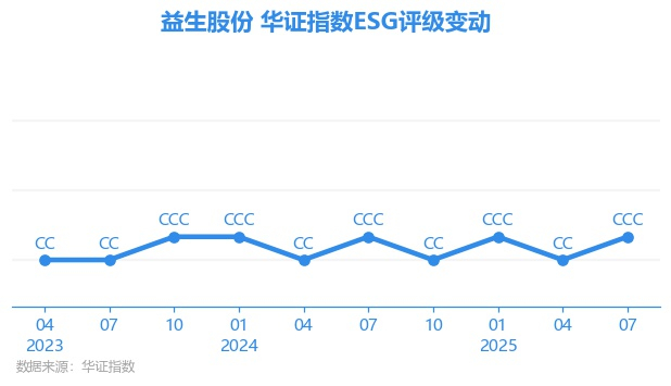 日前,华证指数公布了新一期(2025年7月31日)的ESG评级结果,益生股份(002458.SZ)获得CCC评级(华证指数评级为C起至AAA九档,C为最低档,AAA为其最高一级评级/AA为其第二档),上一期(2025年4月30日)ESG评级为CC。本期ESG评级在156家食品行业A股上市公司中排名第82(上一期排名第111)。