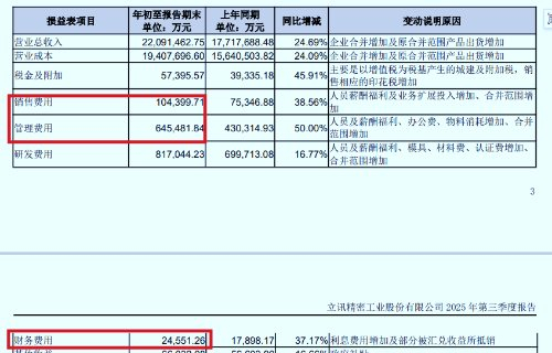 值得注意的是,三季度立讯精密销售费用、管理费用及财务费用合计达41.85亿元,同比剧增79.24%;1至9月,上述费用总计为77.41亿元,同比增长47.92%。