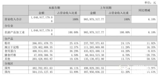 从产品来看,今年上半年,公司四大产品系列中,核心产品粉丝实现收入2.66亿元,同比增长11.92%,豌豆干淀粉收入为1.29亿元,同比增长16.35%,成为主要增长动力,两大产品系列实现了正向增长。而食用蛋白和膳食纤维收入分别为4.01亿元、4705.93万元,分别下降8.01%和28.75%。
