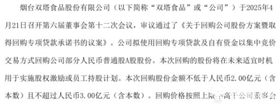 值得一提的是,双塔食品拟使用回购专项贷款及自有资金以集中竞价方式回购公司部分股份,回购股份金额不低于人民币2.00亿元(含本数)且不超过人民币3.00亿元(含本数)。